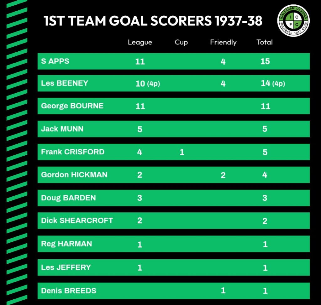 23/10/1937 | Hastings Wanderers II | Home | League | 5 – 1 | S Apps 3, Les Beeney, Les Jeffery |