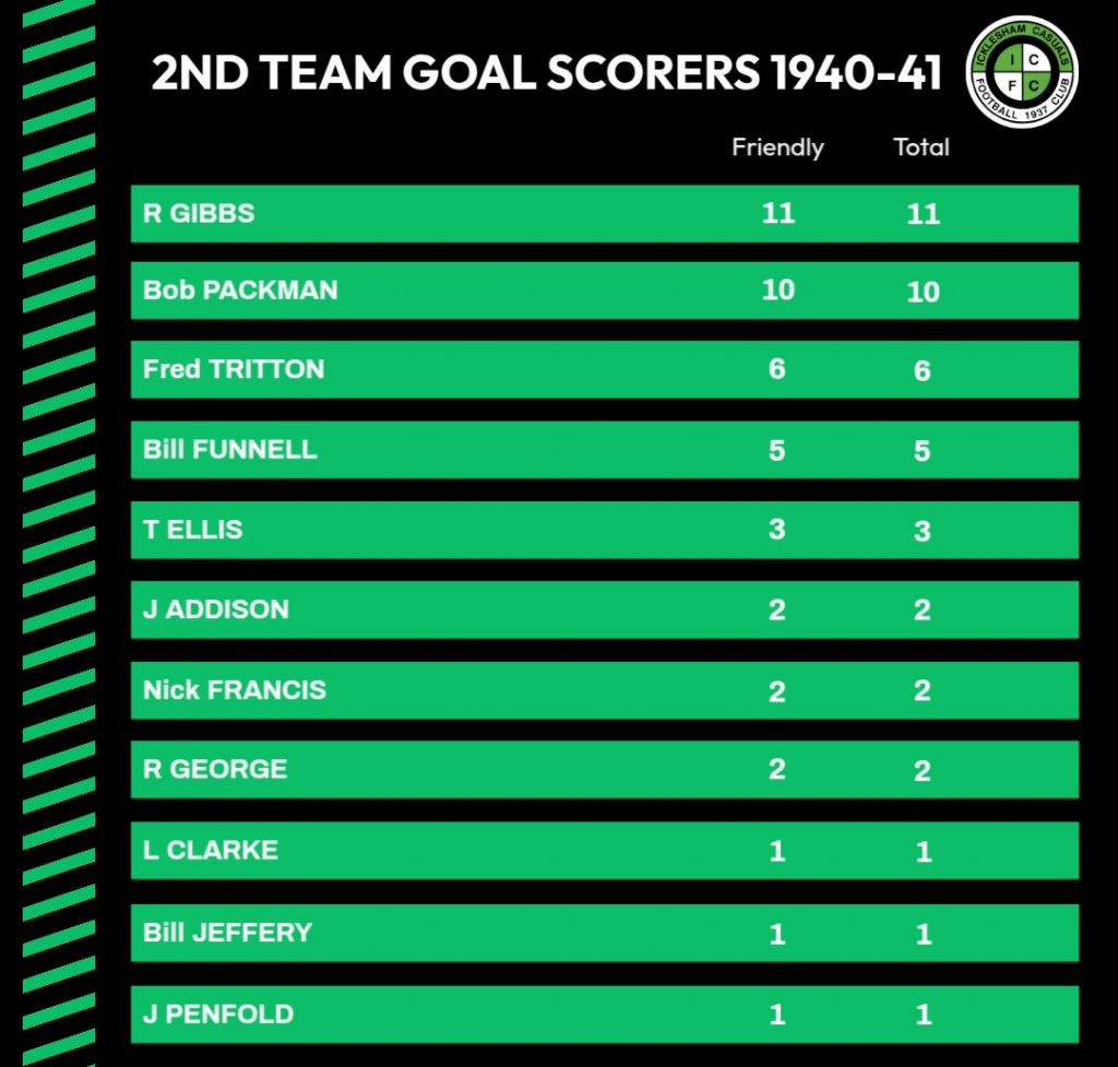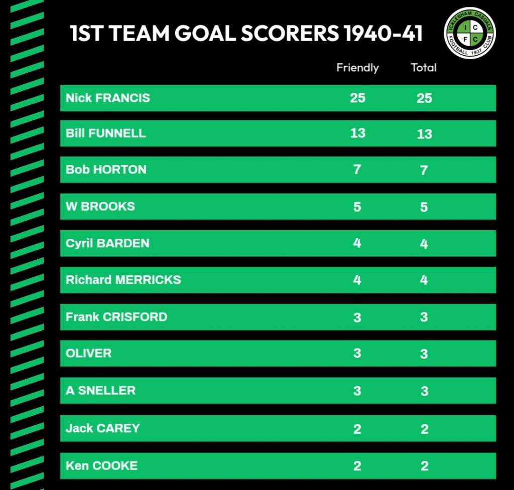 28/12/1940 | ‘C’ Company 133 Field Artillery (Royal Army Medical Corps) (Westfield) II | Home | Friendly | 6 – 4 | Bill Funnell 2, Bob Packman 2, Fred Tritton, R Gibbs |