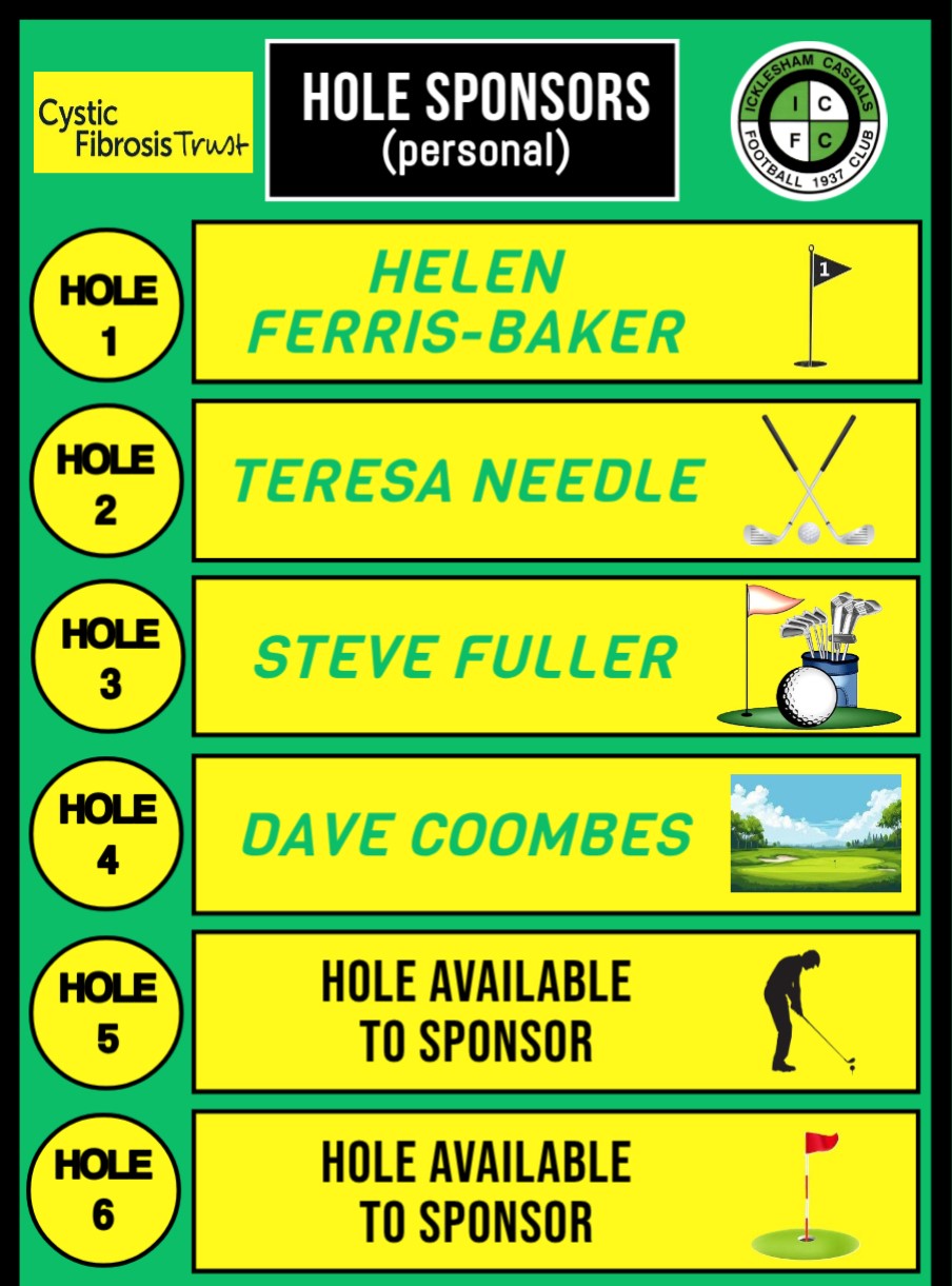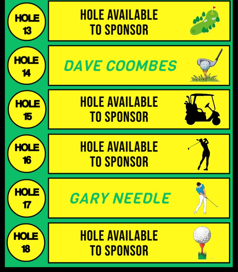 - Sponsor a Hole – Business sponsorship a minimum of £50 per hole and Personal sponsorship £20 per hole