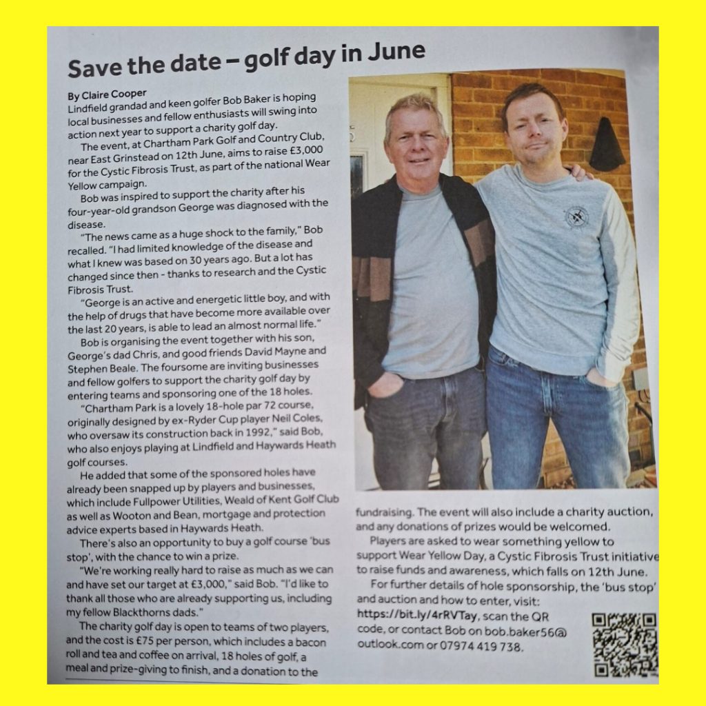 The Wear Yellow for Cystic Fibrosis Charity Golf Day will be held on Friday, 12th June 2026 at Chartham Park Golf and Country Club near East Grinstead.